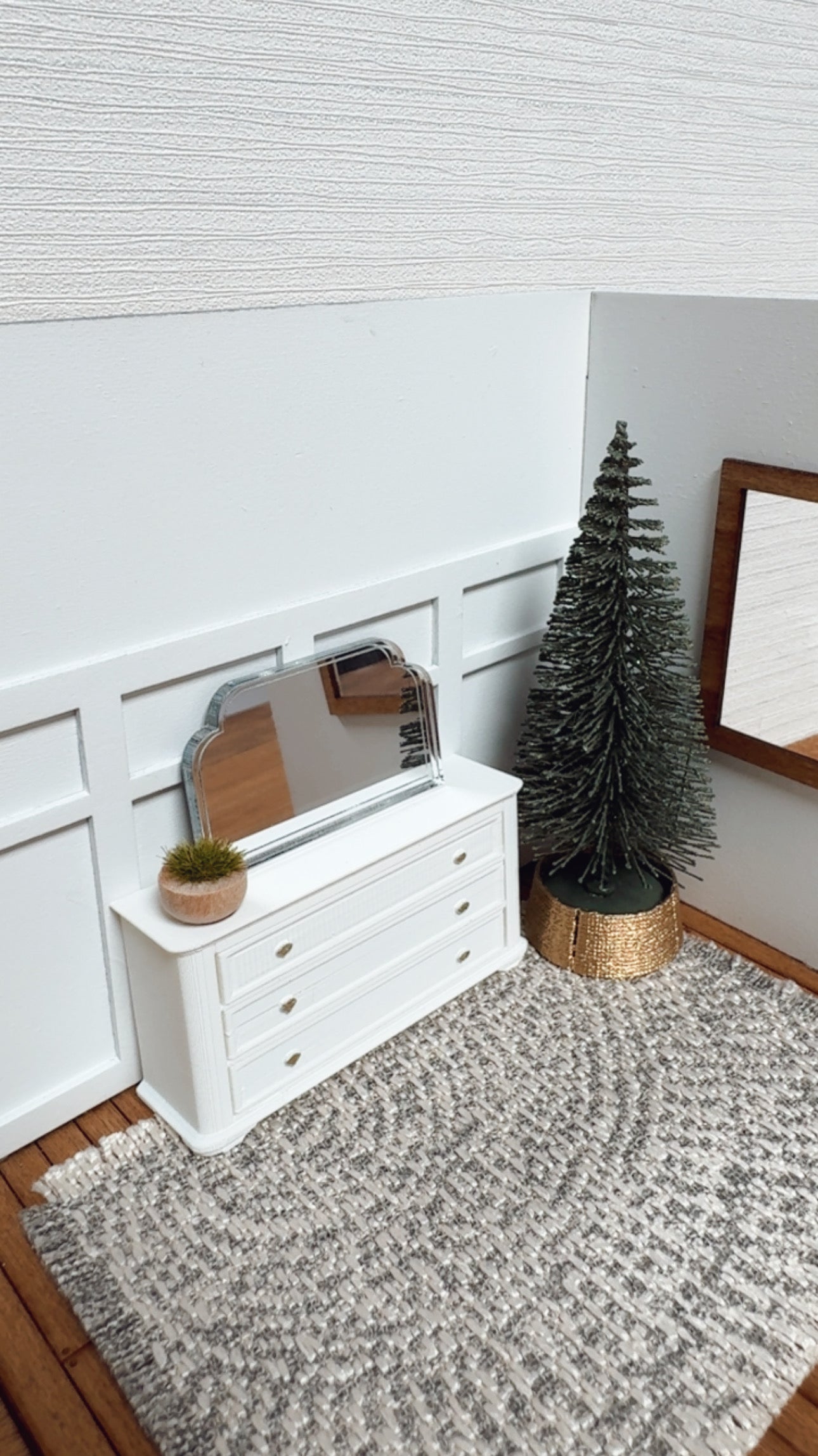 A modern arched mirror designed to add depth and realism to any 1:24 scale dollhouse or roombox. The clear reflective surface creates a true mirror effect, making it perfect for styling entryways, bedrooms, living rooms, or shelf vignettes.