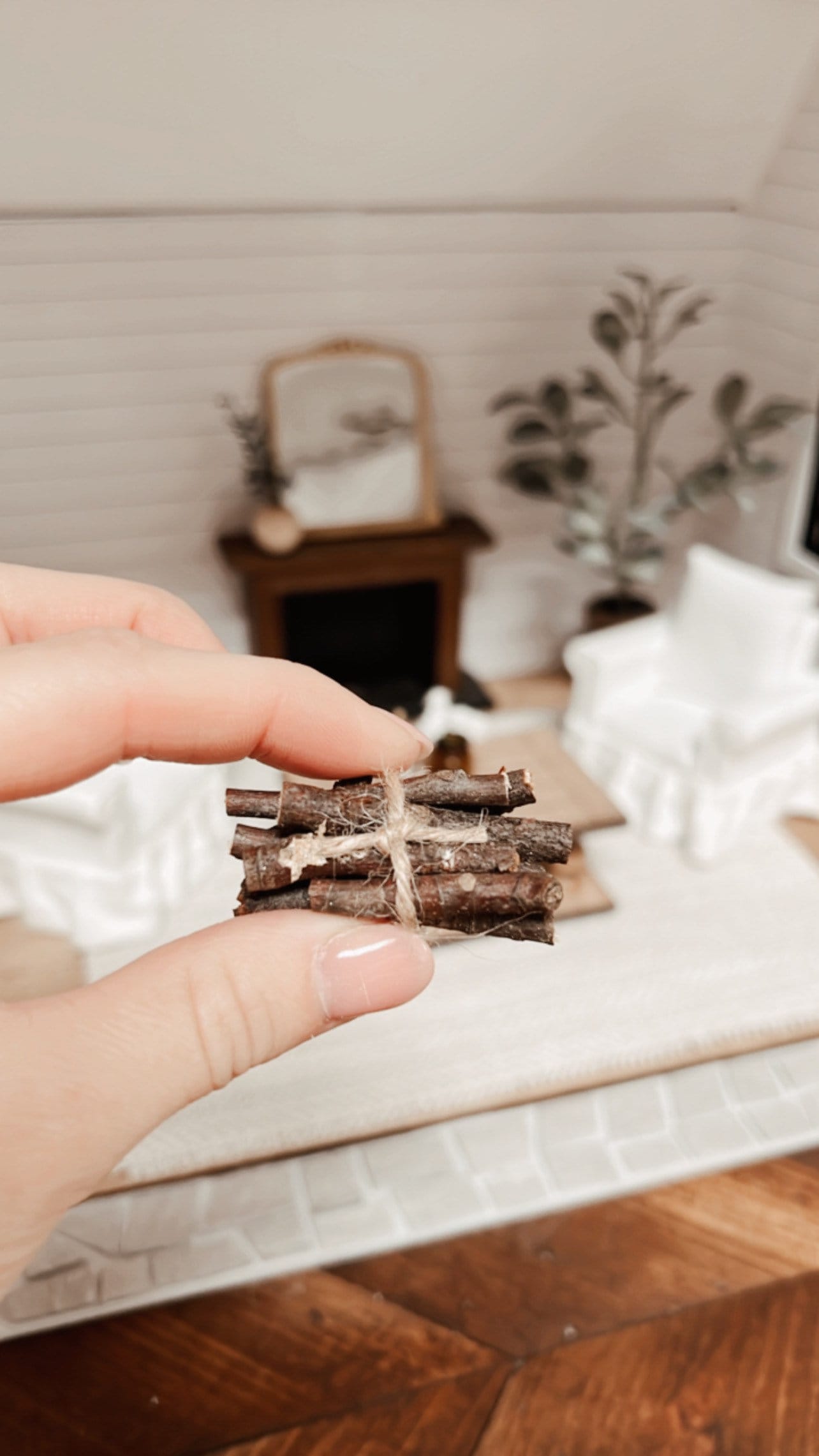 Dollhouse miniatures firewood bundle. Perfect to place in a fireplace or in the living room for decor. The bundle is wrapped in twine for a rustic touch. The bundle measures about 2" long and 1" wide.