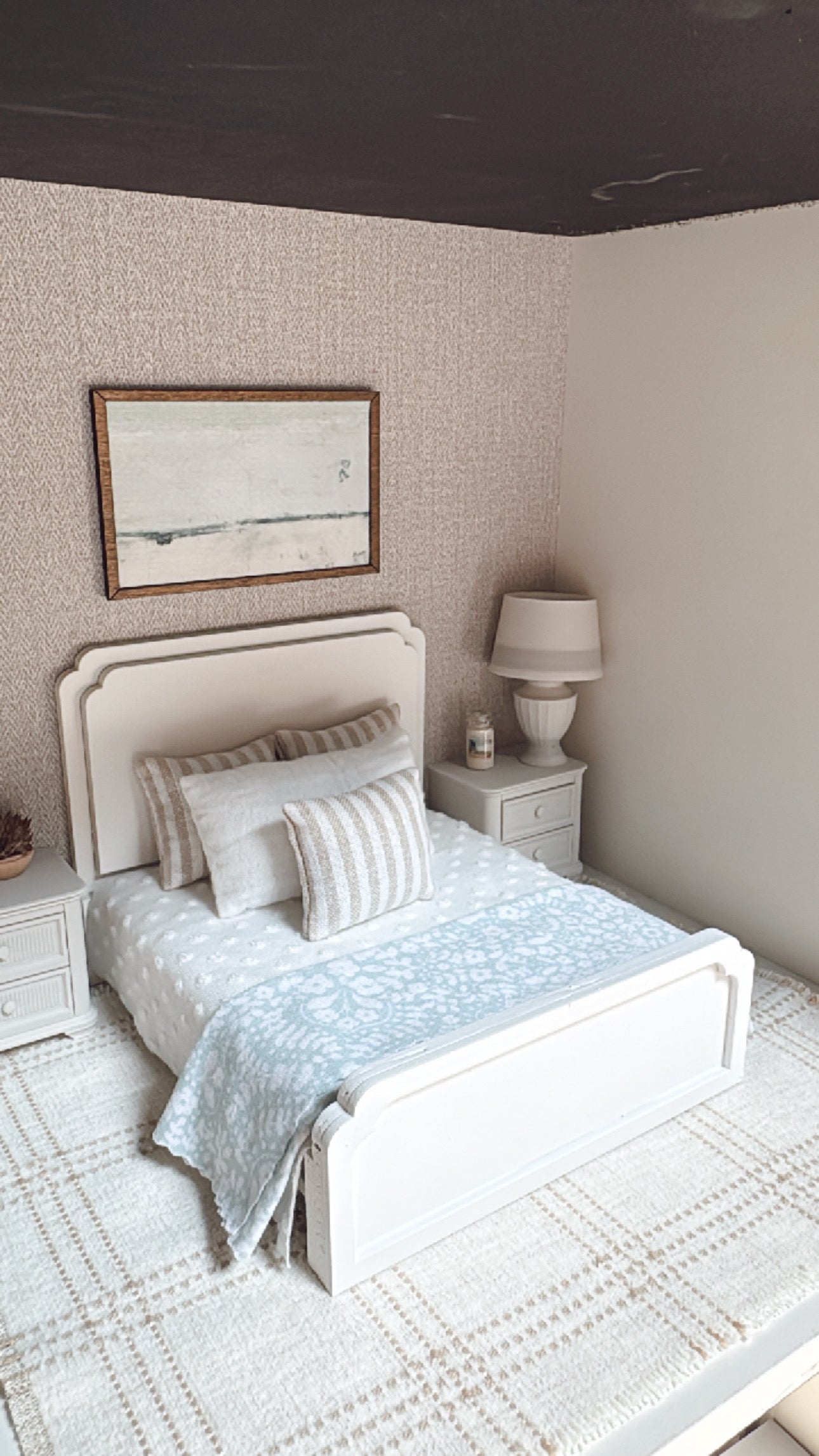Add a soft, serene touch to your miniature space with this soft blue floral blanket. Measuring approximately 6” by 8”, this delicate accessory is perfect for draping over a dollhouse sofa, bed, or chair. The soft blue features a white floral pattern that adds charm and texture, making it a must-have for any cozy cottage or farmhouse-style scene. Ideal for 1:12 scale miniatures.