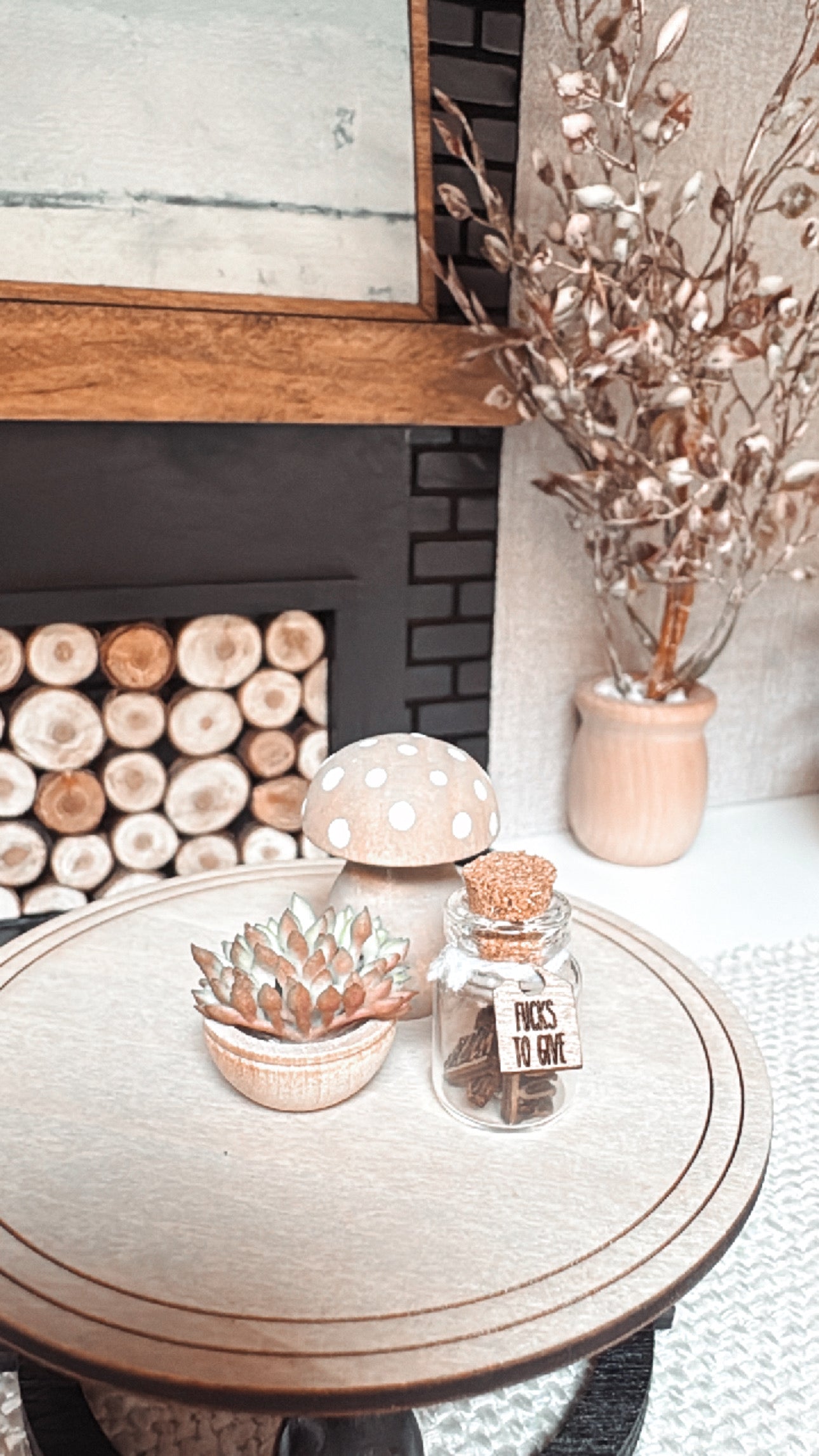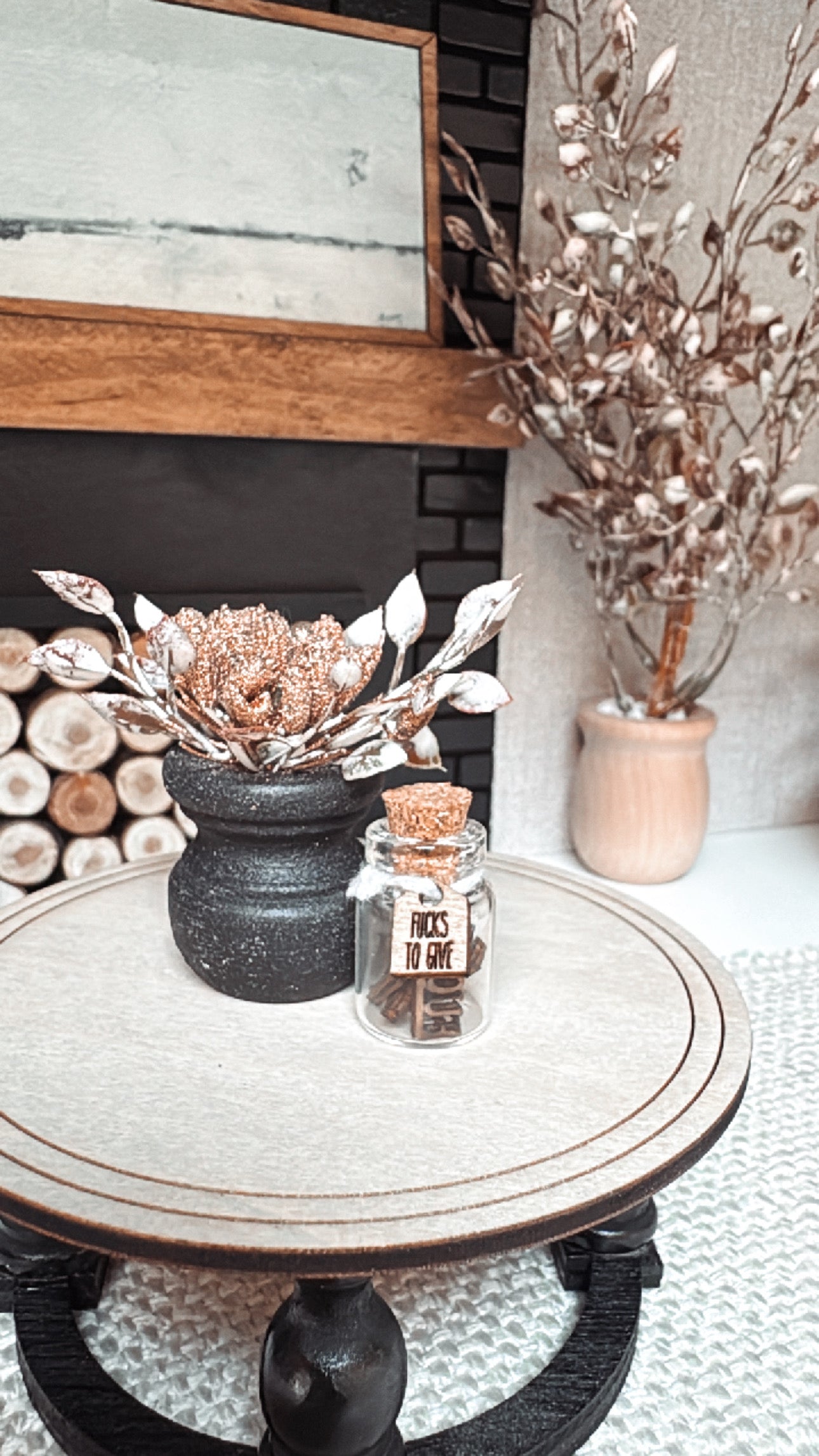 Bring a cheeky touch of humor to your dollhouse décor! This tiny glass jar with a cork top is filled with miniature wooden “fucks” and comes with a laser-engraved wooden tag that reads “Fucks to Give.” Perfect as a playful conversation piece for your miniatures collection.